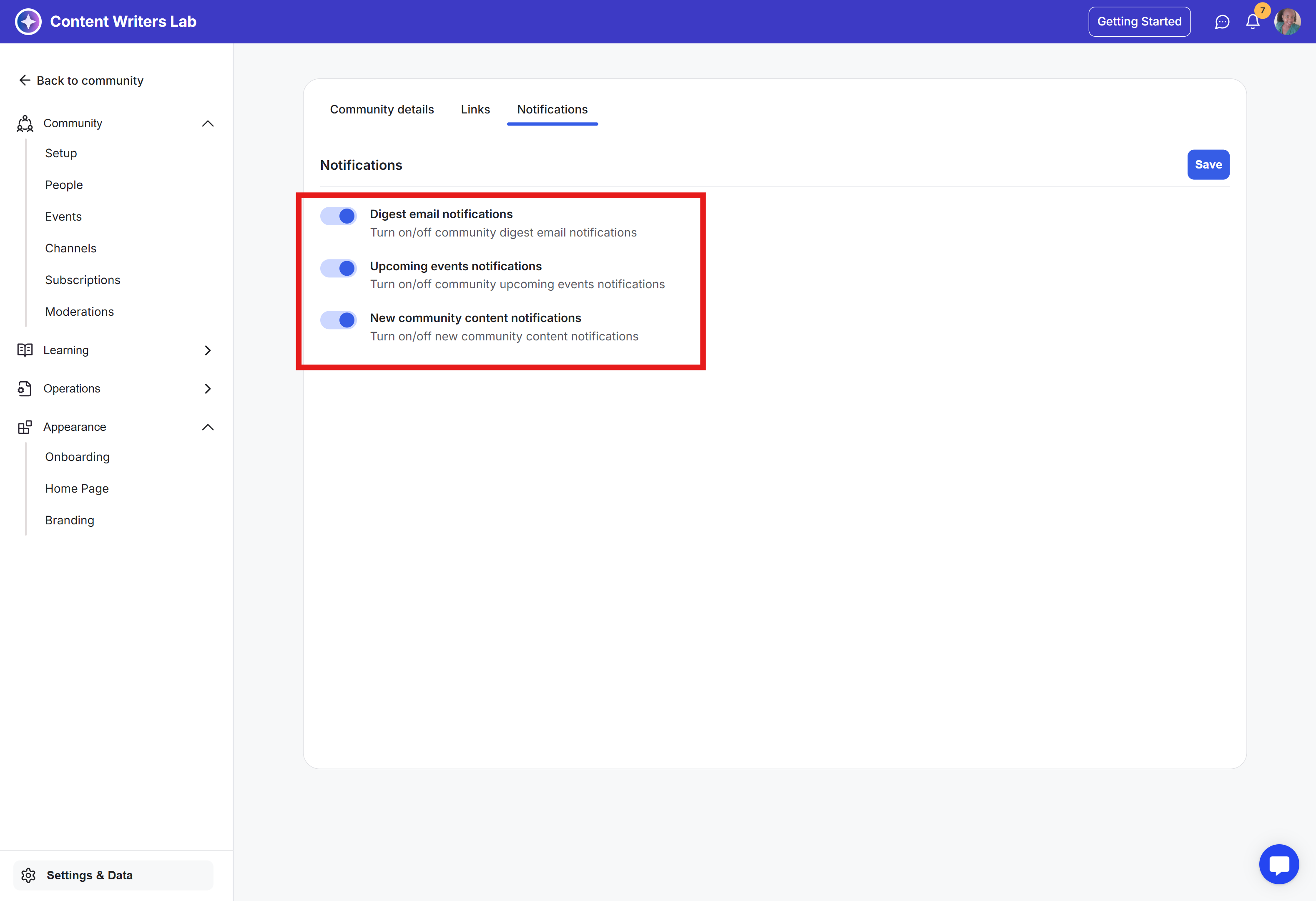 Upcoming events notifications: Turn on or off notifications for upcoming community events.