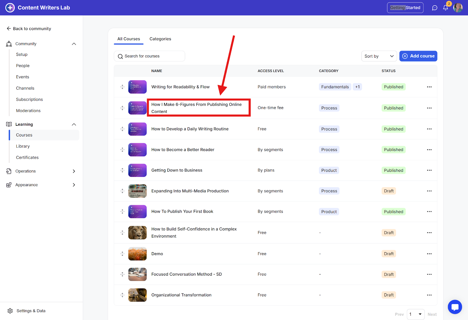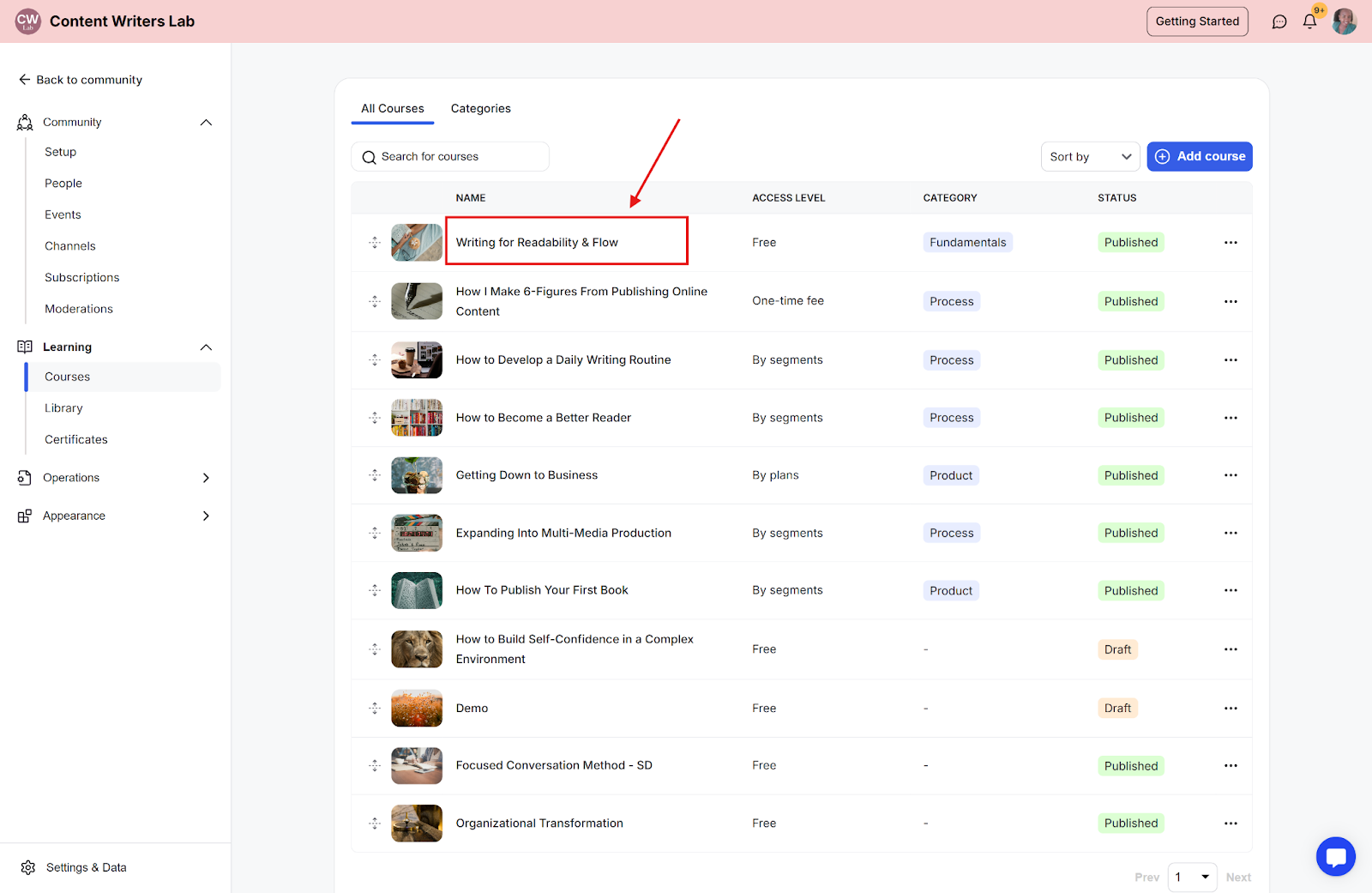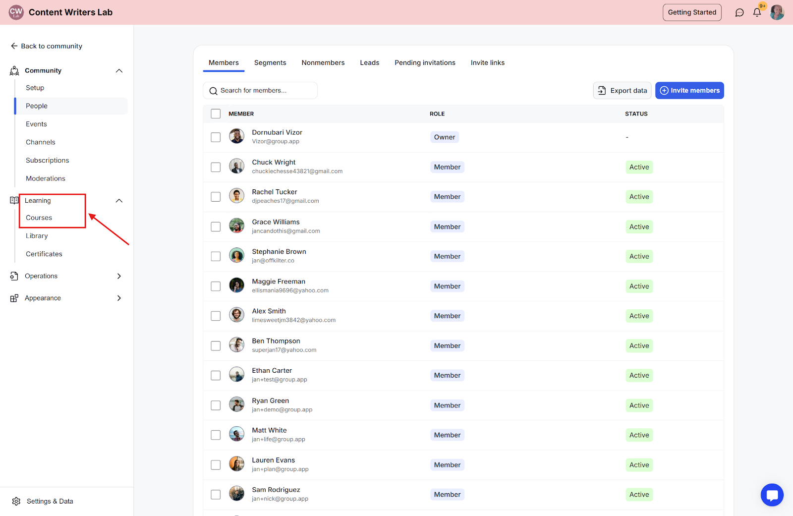 Step 2: In the left navigation menu, go to Learning and click Courses.