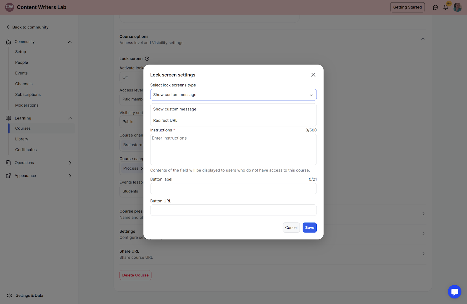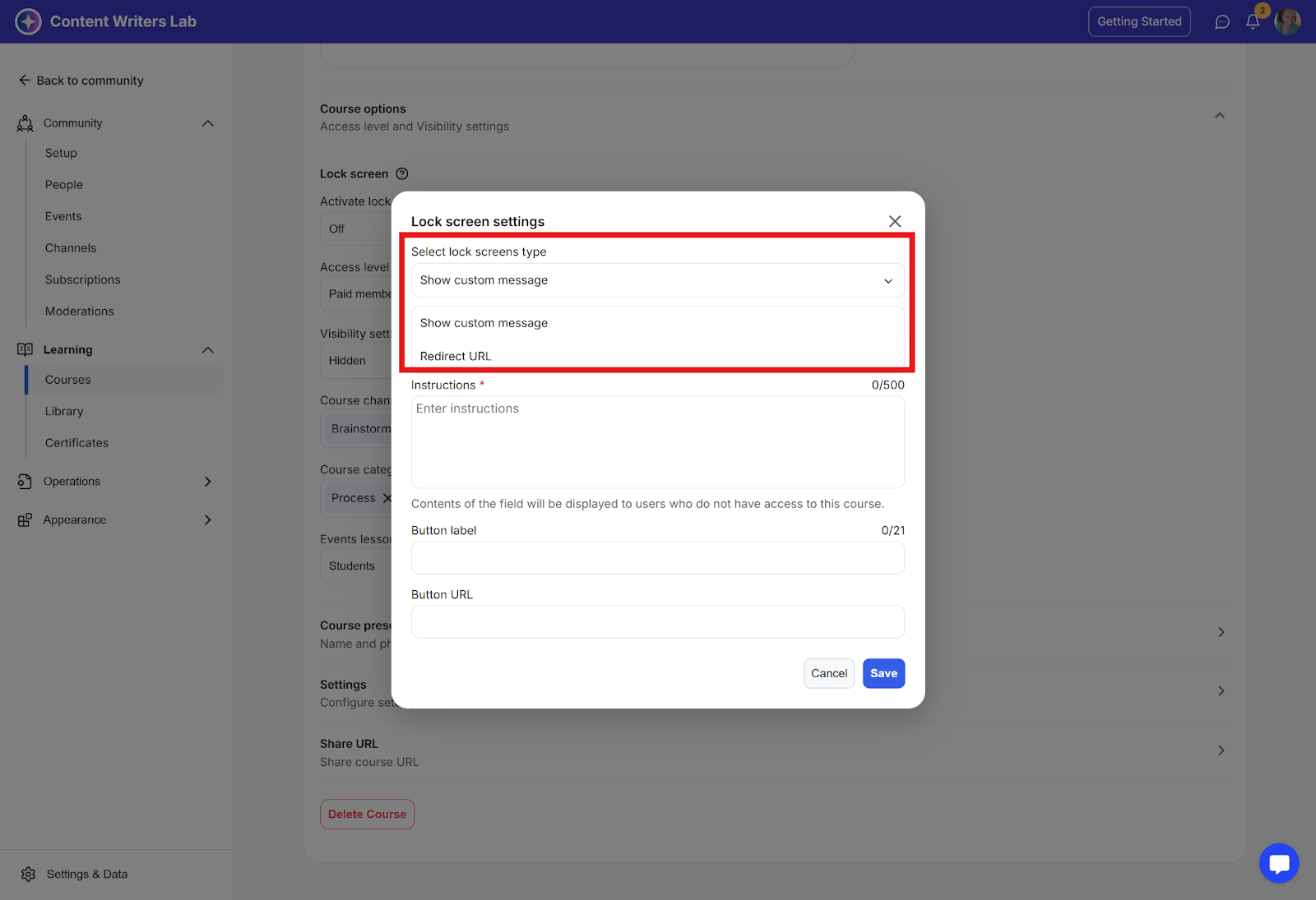 Step 7:Use the Select Lock Screen Type dropdown to choose how the lock screen behaves: either display a custom message to your members or redirect them to a specific URL.