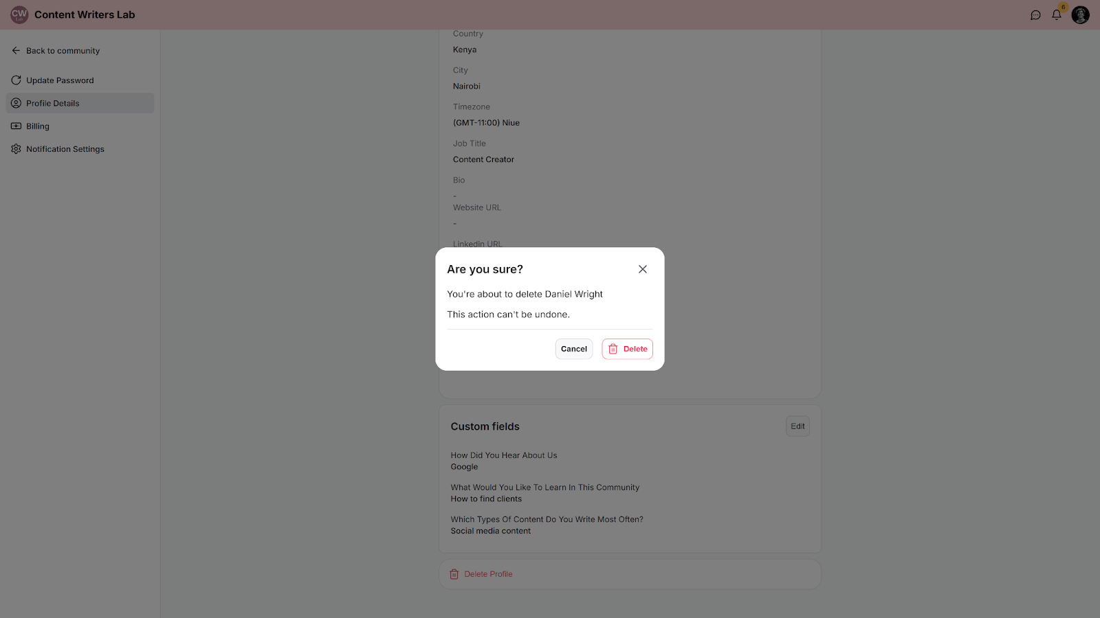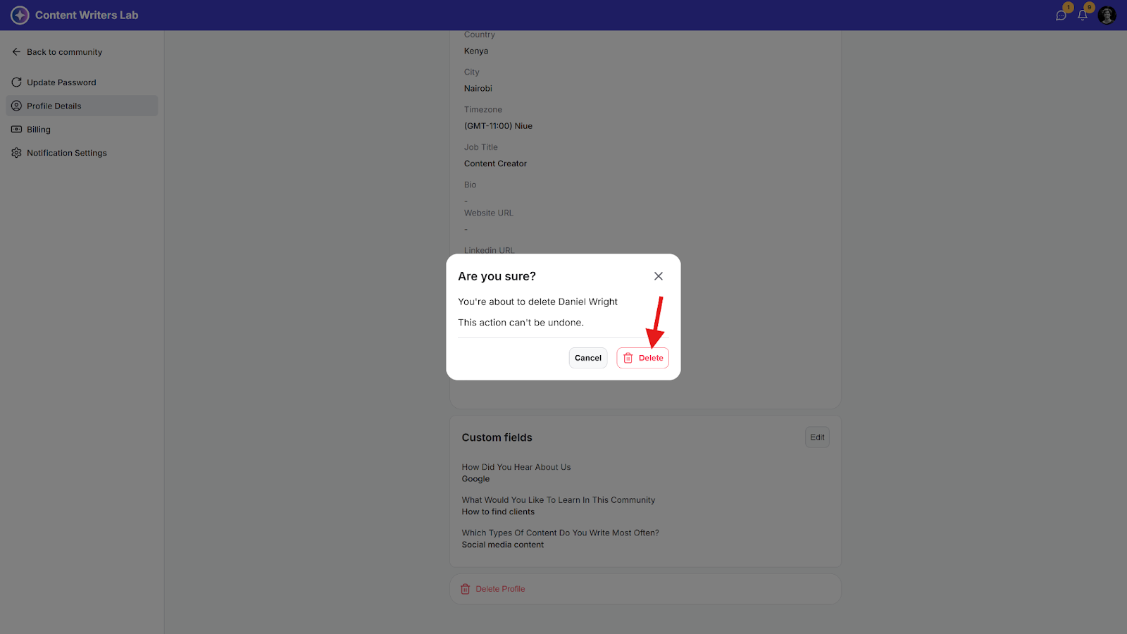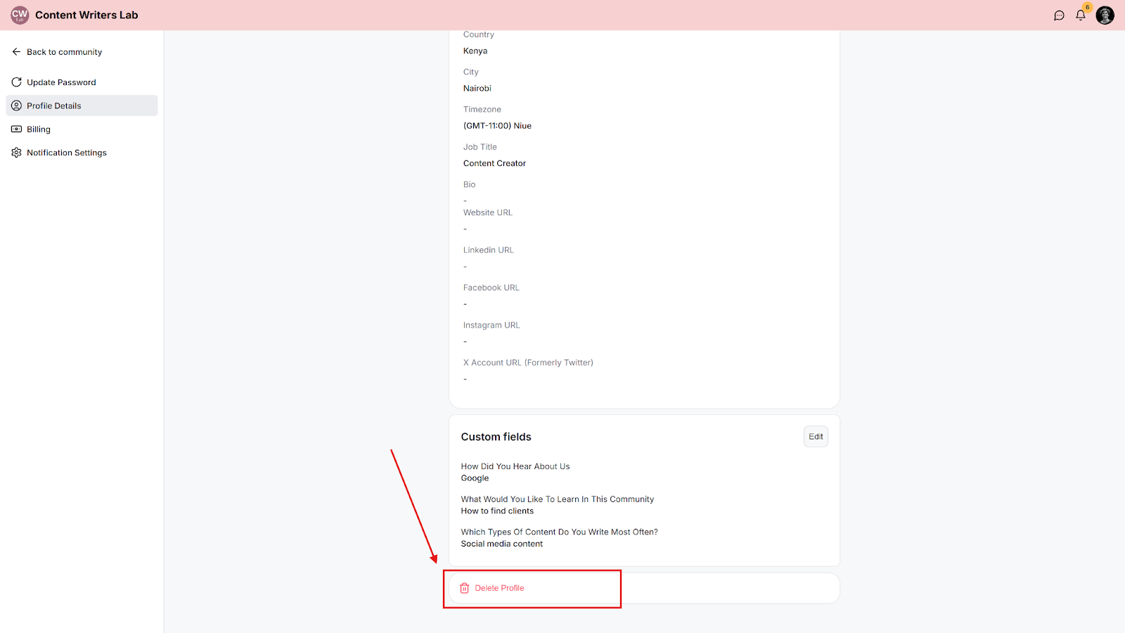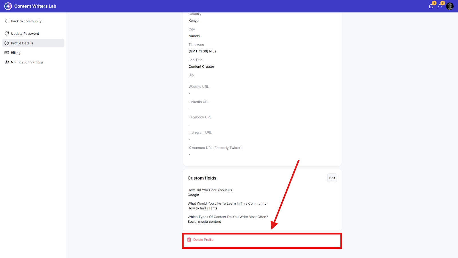 NOTE: Deleting your profile is not possible if you are still an owner of a community. The community will need to be deleted first to delete your profile.