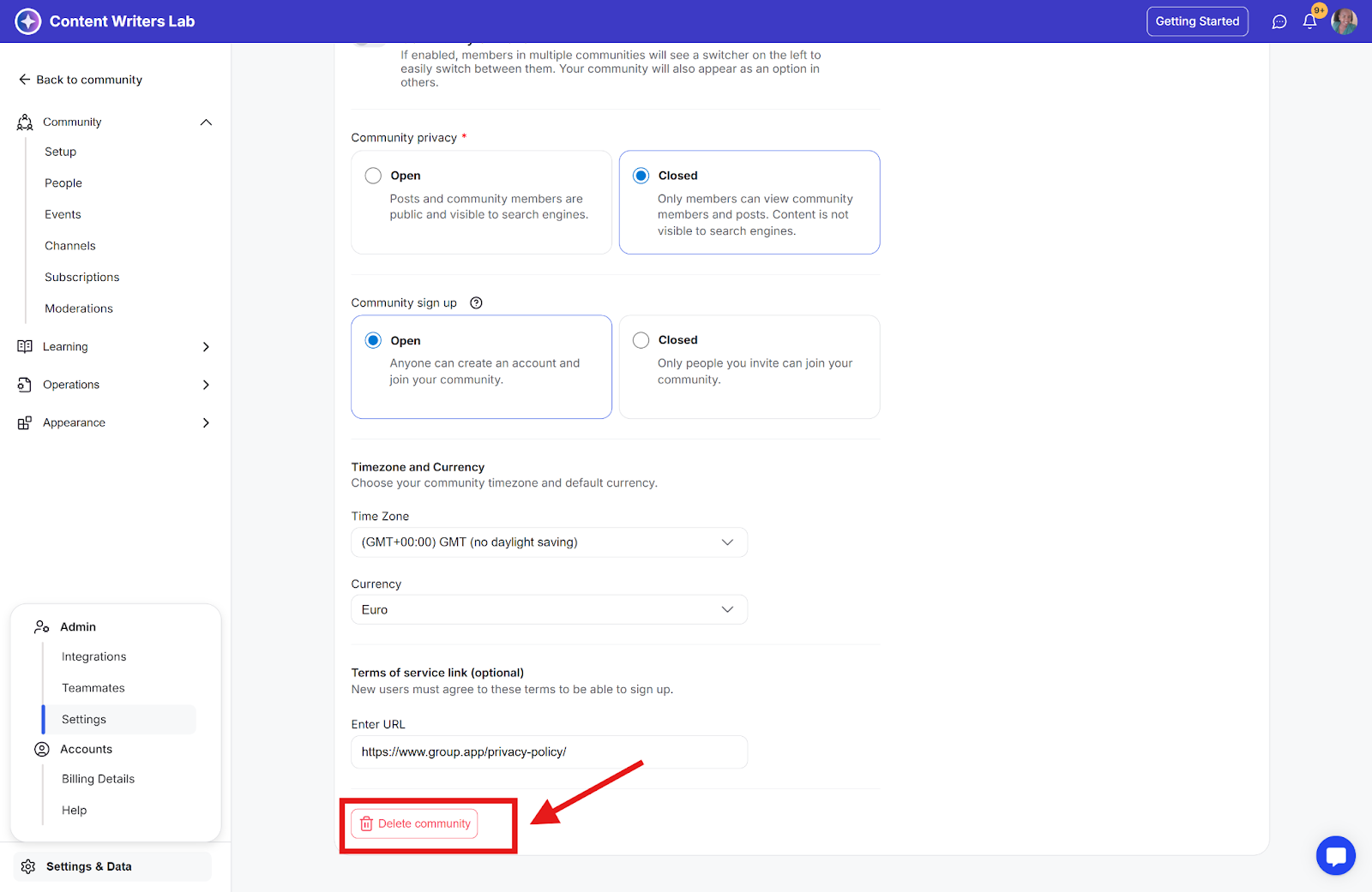 Step 3: Scroll down on the Community Details tab and click the Delete Community button.